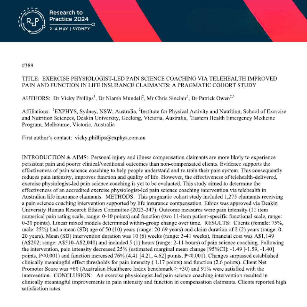 This study provided retrospective analysis of a pain science program delivered by the wider EXPHYS team, to 1,275 people living with persistent pain. Exercise physiologist-led pain science coaching resulted in clinically meaningful pain reduction and functional improvements, return to work outcomes, and positive customer experience. A wonderful collaboration between EXPHYS, Deakin University and AIA Australia.