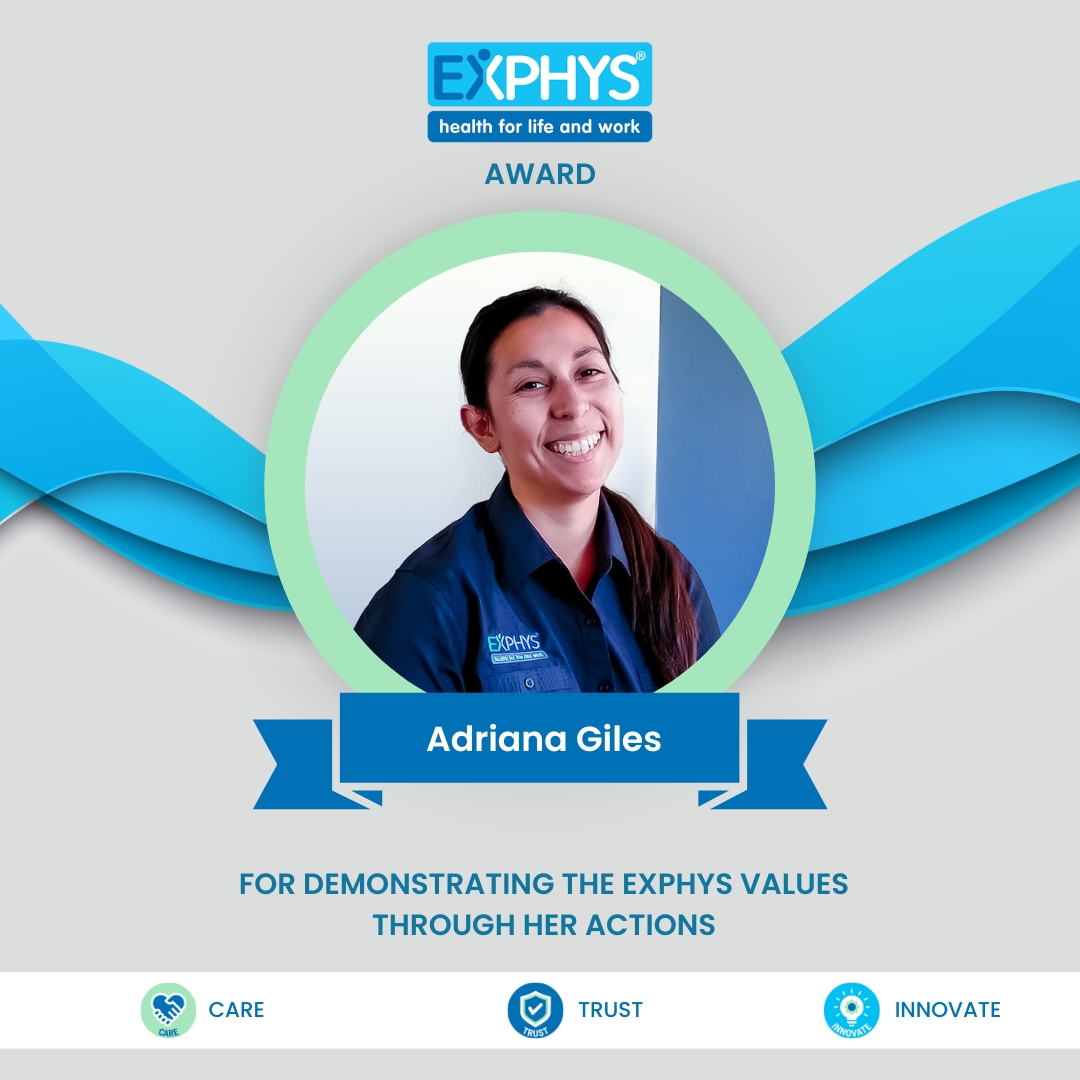 EXPHYS DNA Values Award 🏆 Adriana Giles Congratulations Adriana, EXPHYS Clinical and Rehabilitation Lead, recipient of the EXPHYS DNA Values Award! For demonstrating the EXPHYS values through her actions. Adriana receives constant positive feedback from EXPHYS leadership, partners and the clients she supports. In the words of EXPHYS leadership, partners and Adriana’s client: CARE – “ Adriana cares about our team delivering quality services. She is amazing at running our internal professional development and facilitating Mental Health First Aid .” EXPHYS leadership team. TRUST – “ I trusted Adriana to support me returning to work as a train driver. She helped me build my confidence and helped me and my work get me back on the trains. ” Client that completed EXPHYS program. INNOVATION – “ Adriana is a phenomenal speaker! I loved how she engaged the audience using so many innovative ways and the latest technology .” EXPHYS insurance partner. Well done Adriana 🙌 Get to know Adriana: https://www.exphys.com.au/staff/adriana-giles
